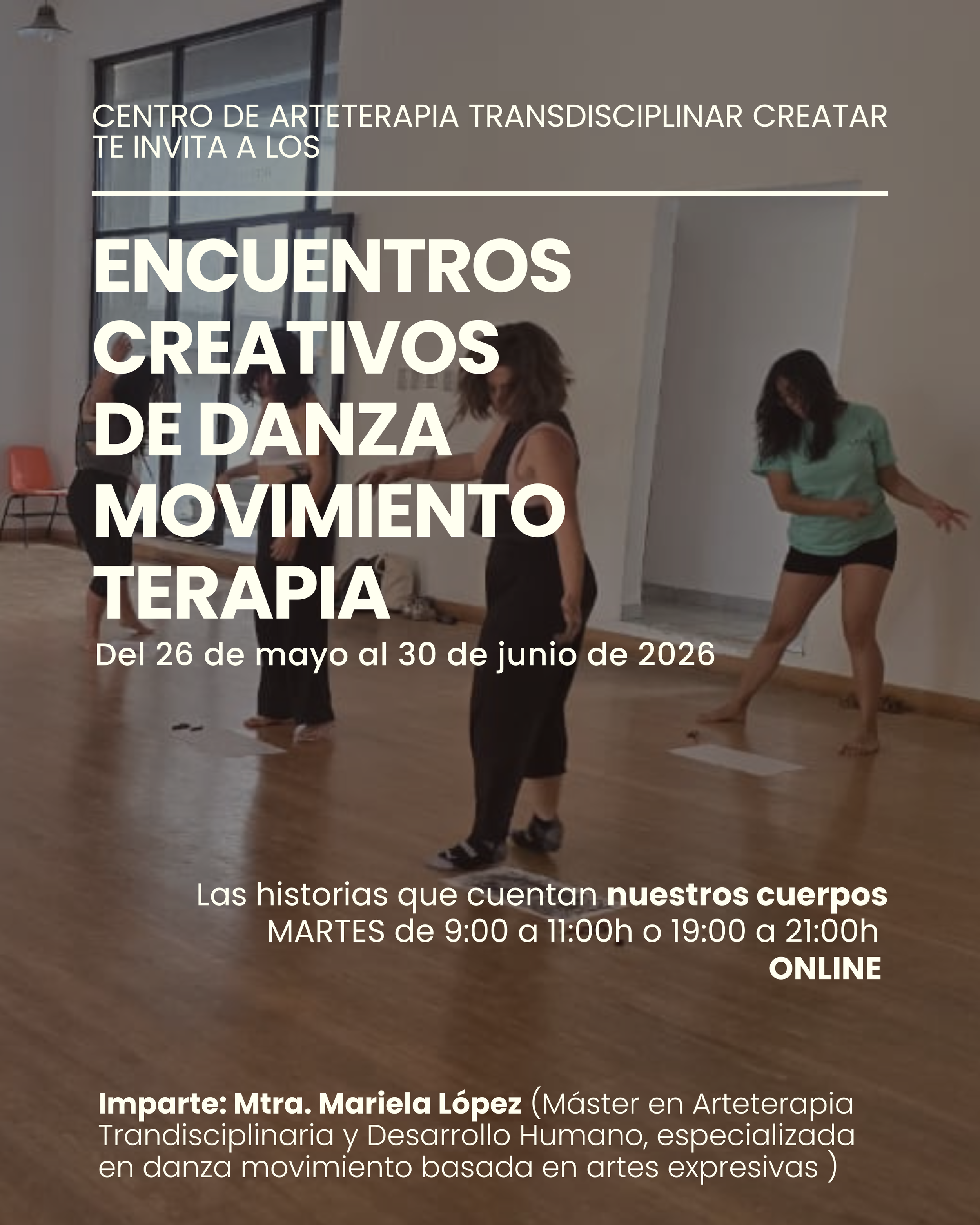 El taller será una experiencia terapéutica que utilizara el movimiento y la danza como medio para promover el bienestar físico, emocional y mental. El enfoque del DMT se basa en la idea de que el cuerpo y la mente están profundamente conectados y que el movimiento puede ser una poderosa herramienta para explorar, expresar y transformar las emociones, pensamientos y experiencias.